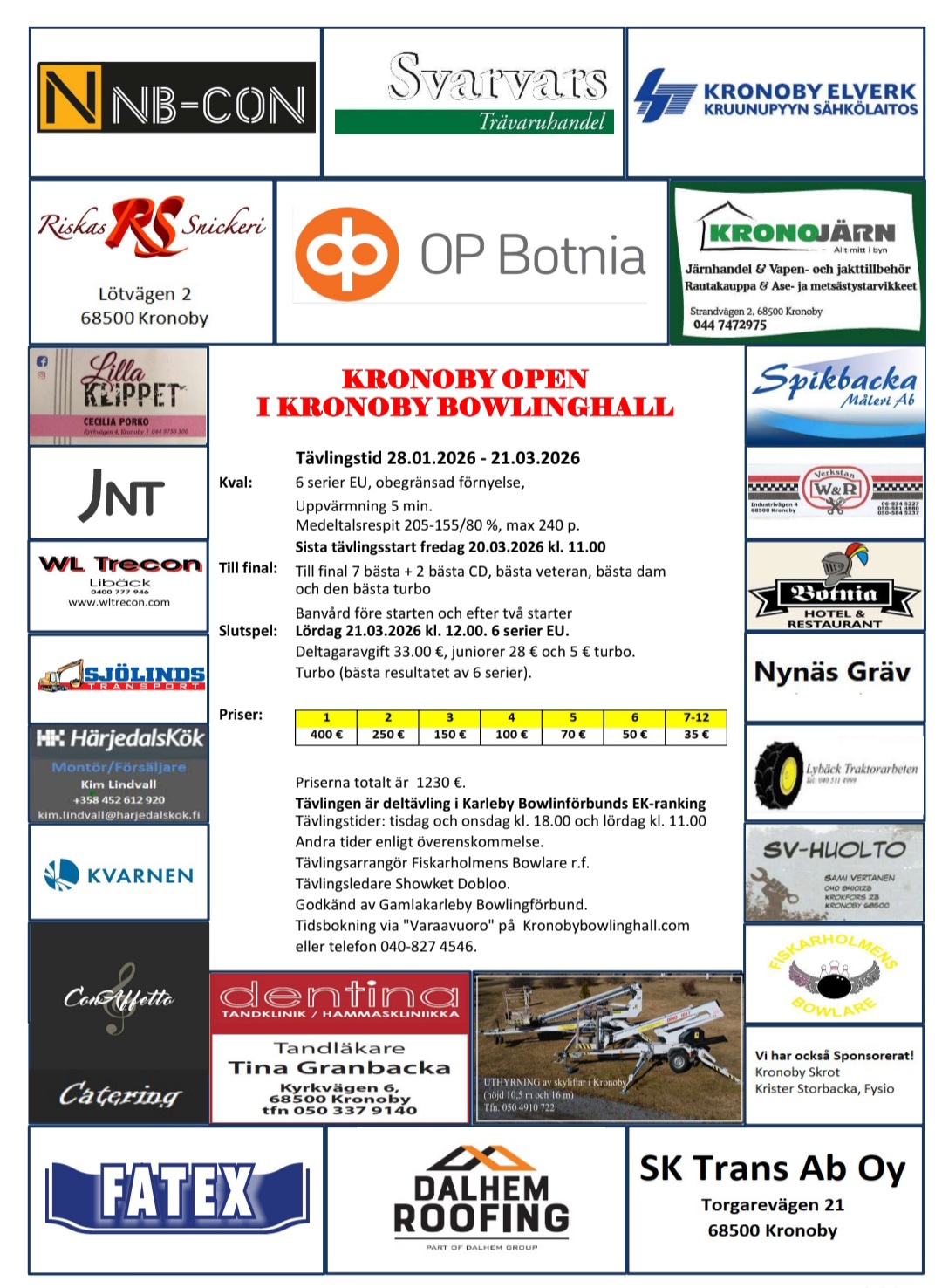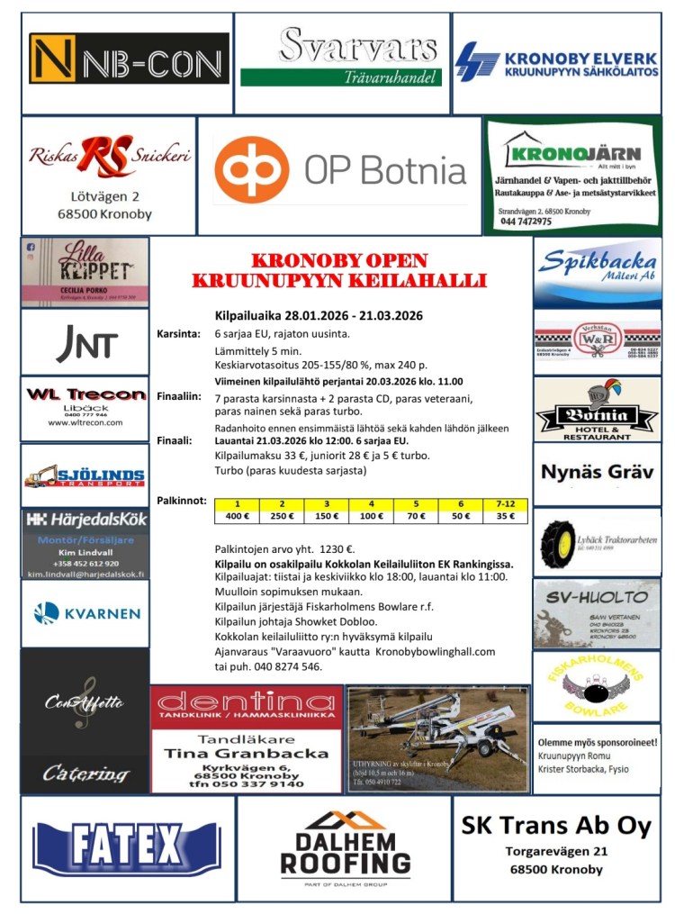 Tävlingar/Kilpailut Tidsreservering även via telefon/ Ajanvaraus myös puhelimitse: 040-827 4546 eller via e-post/tai sähköpostitse: kronobybowlinghall@gmail.com Tävlingsstarter/Kilpailulähdöt: Tisdag/Tiistai 18.00 Onsdag/Keskiviikko 18.00 Lördag/Lauantai 11.00
